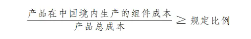 產(chǎn)品在中國境內(nèi)生產(chǎn)的組件成本占比應(yīng)當(dāng)達到規(guī)定比例,計算公式為: